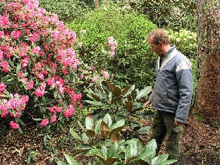 Herbert Tönjes and Osmo Jussila looking at leaf shape of Rhododendron oreodoxa var. fargesii Herbert Tönjes ja Osmo Jussila tutkivat Rhododendron oreodoxa var.…
