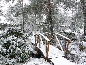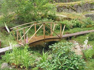 Kaarisilta pienen lammen yli rhodopuutarhassa.Rhodopuutarhan kaarisilta varhain toukokuussa 2003 ennen kasvukauden alkua.Kesän vehreyttä kaarisillan ympräristössä.Tervattu kaarisilta heinäkuussa 2007.Rhodopuutarhan kaarisilta maaliskuussa 2008.