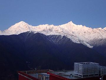 An early morning view from the balcony of the hotel room, temperature outside was a bit chilly, -12 °C.An early morning view to Kawakari (6740 m) from the balcony of the hotel roomA quick stop on the way to Gongkahu, Kawakari (6740 m) in the horizonDeqen up on the other side of the valley where we came fromStarting point for the trek up the Gongkahu MountainView up to the Gongkahu Mountain from the road at 3535 m. The yellow-green color is from Ilex section Quercus plants.On the path up the Gongkahu Mountain, 3750 mA view from the Gongkahu Mountain down to Gongkahu Lake, 3750 mTom on the path of the Gongkahu Mountain, 3850 mHans E. investigating Rhododendron × chlorops ( wardii × vernicosum ), 3825 mLandslide on the Gongkahu MountainThe path up to the mountain among QuercusLocal women cut firewood from the trees. We went back to the Feilaisi Mingzhu Hotel in Deqen.