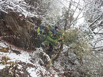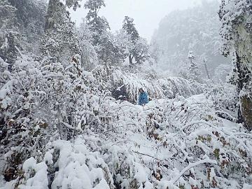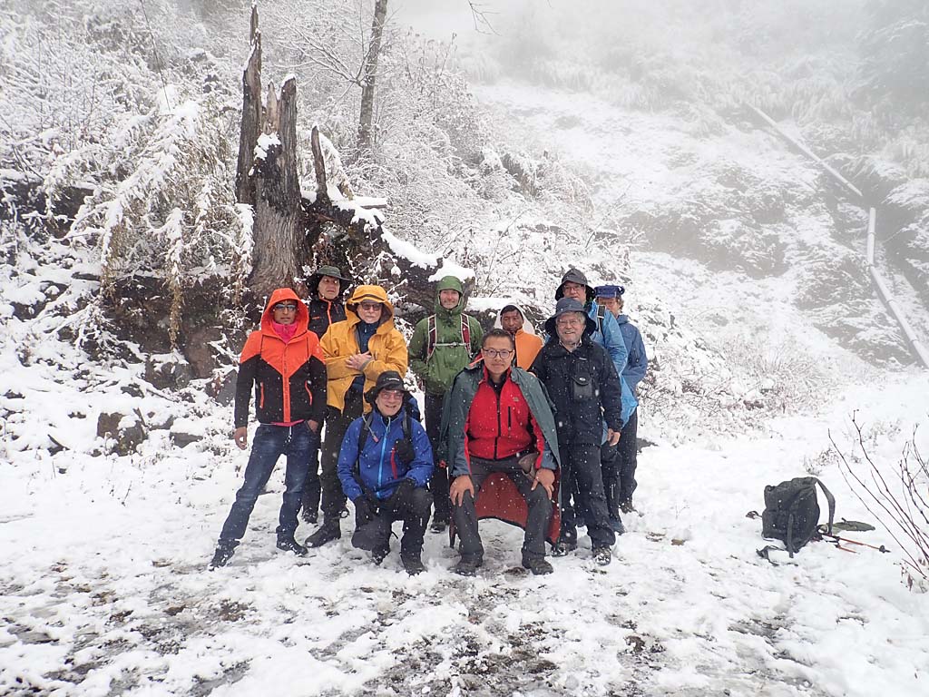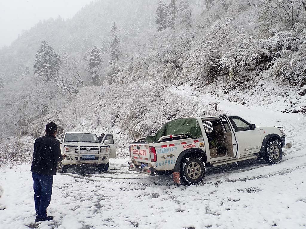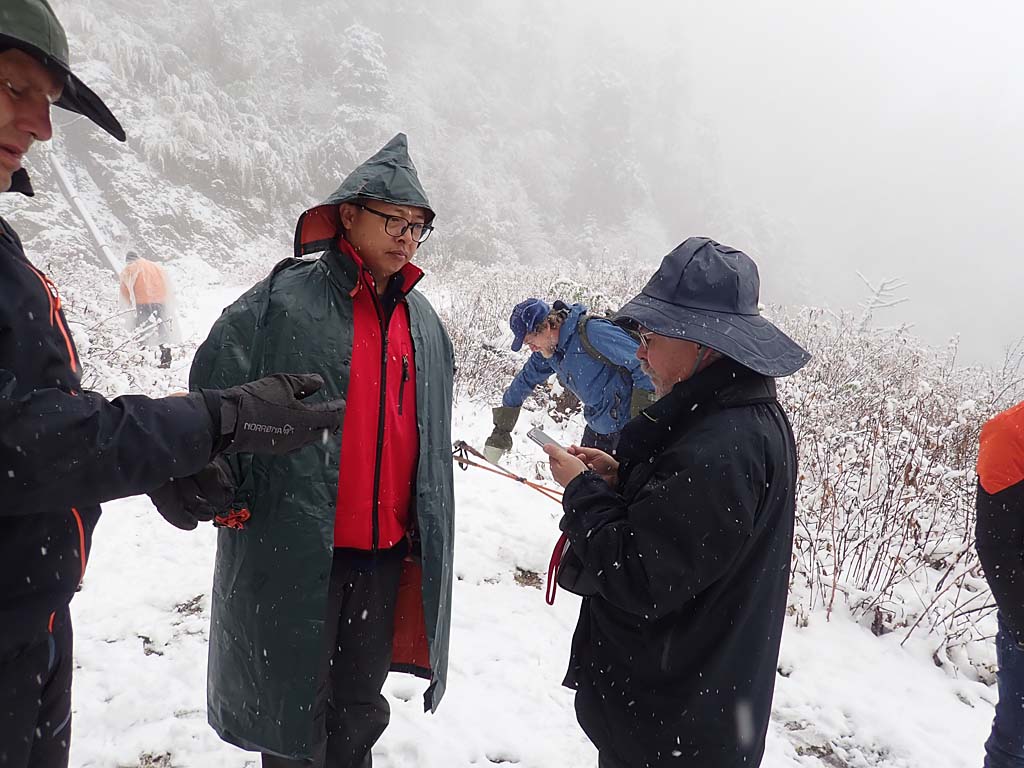 Arriving at the guest house beside the security check point at Nanjieluo, 2900 mIt was raining when we arrived to Nanjieluo and that meant snow at higher altitudesNanjleuo valley, raining at 2900 mIt was snowing when getting up the mountianSnowing ...Snowing ...We stopped at 3500 m because of too bad driving conditionsDiscussing on what to do because of the snow on the roadGroup photoHans S. made a snowmanChecking altitude before starting to walk up. Photo by Matti Huotari.Bent E. trekking up in Nanjieluo, 3500 mSten N. and Hans S. botanizingSnowy slopeA Rhododendron covered with snowChinese women came down from the lakeChinese women told Dennis and Bent E. about the snow conditions up in the lake areaEgil V. trekking up in Nanjieluo, 3550 mDennis and Jan Ole W.Sten N., Dennis and Jan Ole W.More snow ...Not easy to explore plantsSten N. and Rhododendron rex ssp. fictolacteum , 3600 mKristian and Rhododendron rex ssp. fictolacteum , 3600 mMatti H. and our guide Tom in Nanjieluo, 3600 mBack down to wet weatherPigs were going freely close to the guest houseGood room in the guest house, though a bit cold, but I had a sleeping bagDrying our wet clothes