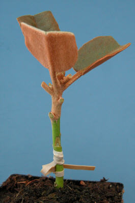 Kuva 9. Varttamista voi tehdä myös juurtumattomalle 'Cunningham's White' oksanpätkälle, jos sopivia pistokas- tai siementaimia ei ole saatavilla perusrungoksi.