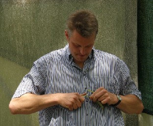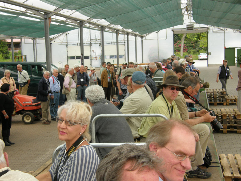 Fredo Schröder Rhododendron-Jungpflanzen, Wiefelstede Timo Schröder and brother, welcome speech Again on straw bale wagons Timo Schröder shows how to make a graft Cotton thread to attach Timo Schröder's graft Paul and Martha Anderson take a close look at the graft Put in peat at this level Well rooted graft Peat wating for cuttings and grafts After rooting the cuttings and grafts are placed in pots After a year the young plants look good Steve and Darling Henning, Karel Bernardy, Bruce Feller, Peter Cox, .. Mitch Gorzkowski, John Roy, Denis Hughes, .. Steve Hootman, Marc Colombel, Annelie Dau, girls from Latvia, Mitch Gorzkowski Rhododendron hybrids Mother plants for cuttings, approx. 12 hectars Mother plants More mother plants