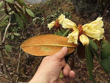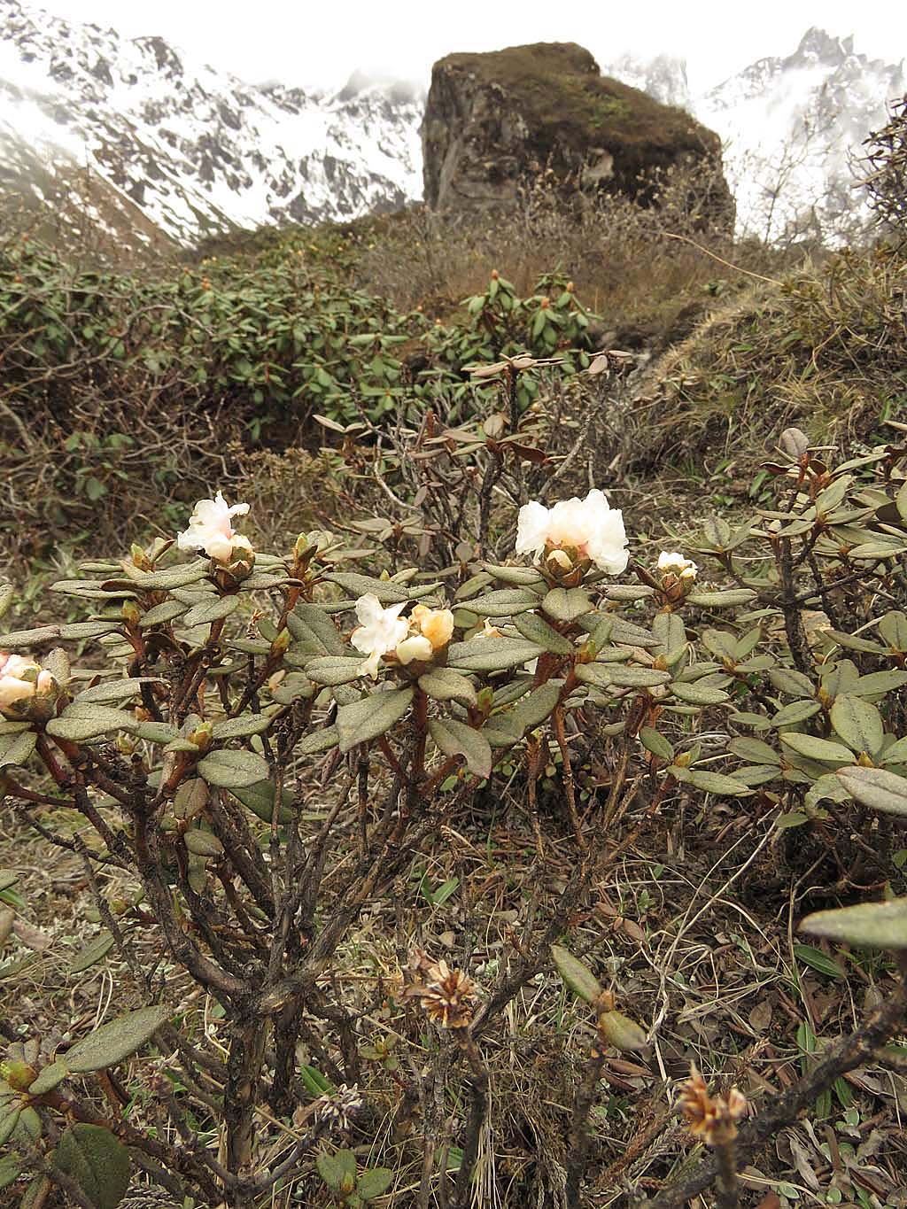 Rhododendron falconeri , Phenang - Tshoka 3100 mRhododendron grande , Bakhim - Tshoka 2800 mRhododendron hodgsonii , Yumthang Valley 3500 mRhododendron griffithianum , Sachen -Tshoka 2650 mRhododendron arboreum , close to Tshoka 2900 mRhododendron barbatum , Tshoka 2900 mRhododendron thomsonii , Tshoka - Dzongri 3800 mRhododendron campanulatum , Dzongri 4000 mRhododendron wallichii , Yumthang Valley 3700 mRhododendron campanulatum ssp. aeruginosum , Thangu - Muguthang 4200 mRhododendron niveum , Yumthang Valley 3500 mRhododendron fulgens , Yumthang Valley 3400 mRhododendron sikkimense , Yumthang Valley 3300 mRhododendron wightii , Thangu - Muguthang 4200 mRhododendron campylocarpum , Yumthang Valley 3500 mRhododendron , told to be white form of R. thomsonii but morphologically looks more like a white form of R. wallichii , Yumthang Valley 3700 mRhododendron cinnabarinum , Yumthang Valley 3500 mRhododendron maddenii , Chungthang 1800 mRhododendron vaccinioides with opened seedpods, Lachen - Lachung 3000 mRhododendron pendulum , Lachung - Yumthang at Yaktse lodge 3080 mRhododendron lepidotum , Yumthang Valley 3600 mRhododendron setosum , Thangu - Muguthang 4200 mRhododendron anthopogon , Thangu - Muguthang 4200 mRhododendron ciliatum , Lachung - Yumthang at Yaktse lodge 3080 mRhododendron glaucophyllum , Yumthang Valley 3400 mRhododendron triflorum , Lachung 2900 m